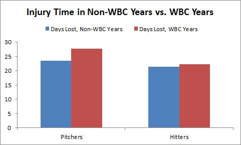For that, we need different research. Late last month, three members of the Wash U Sports Analytics group (Adam Kaufman, Sam Linker, and Jacob Gross) did a study on WBC injury rates in which they compared the number of days each WBC participant spent on the disabled list in the season immediately following his WBC appearance with the average number of days the same players spent on the DL in the three seasons preceding their WBC year and the three seasons after, wherever applicable. For example, if a player participated in the 2013 WBC, his DL days in 2013 would be compared with the average of his DL days from 2010 to 2012 and from 2014 to 2016. (If a player wasn’t active over the whole seven-year sample, any years when he was active were included in the calculations of the overall averages.) If the WBC injury effect is real, we would expect the number of DL days in the WBC year to be higher than the average from the surrounding years.