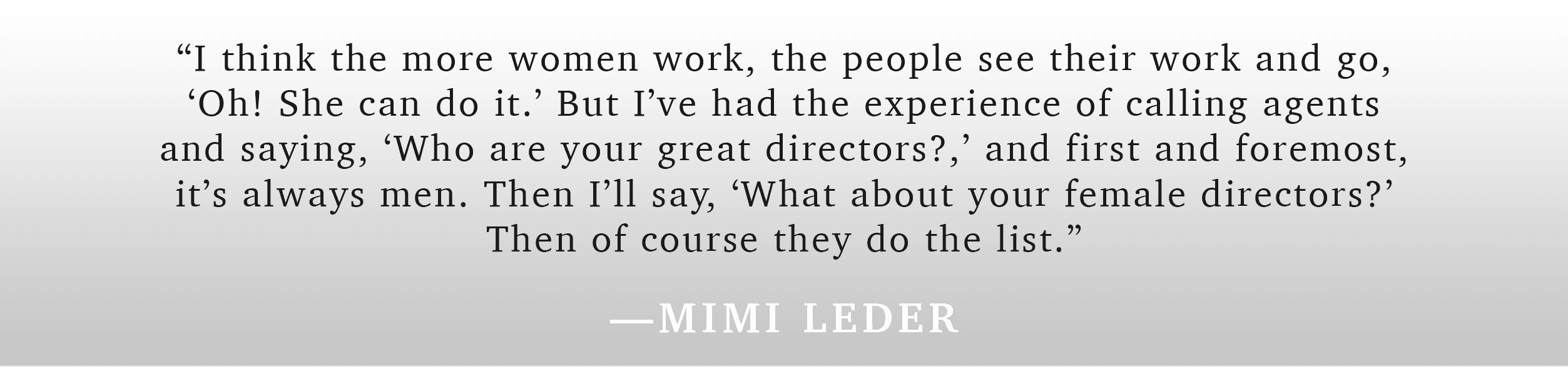 When I ask Mimi to elaborate on why she thinks this happens to female directors more than their male counterparts, she muses, “Maybe it’s as simple as, ‘Hey, you look like me! You’re a white guy, you wear a baseball hat, come on in. Come join the club.’ I think there’s a safety [to that]. It’s insanity, but it still exists. Look at the numbers, still. … It’s certainly not because we [women] are less talented, or don’t have the ability to make big films, small films — all sizes. It’s obviously not true that we don’t work as hard.”
