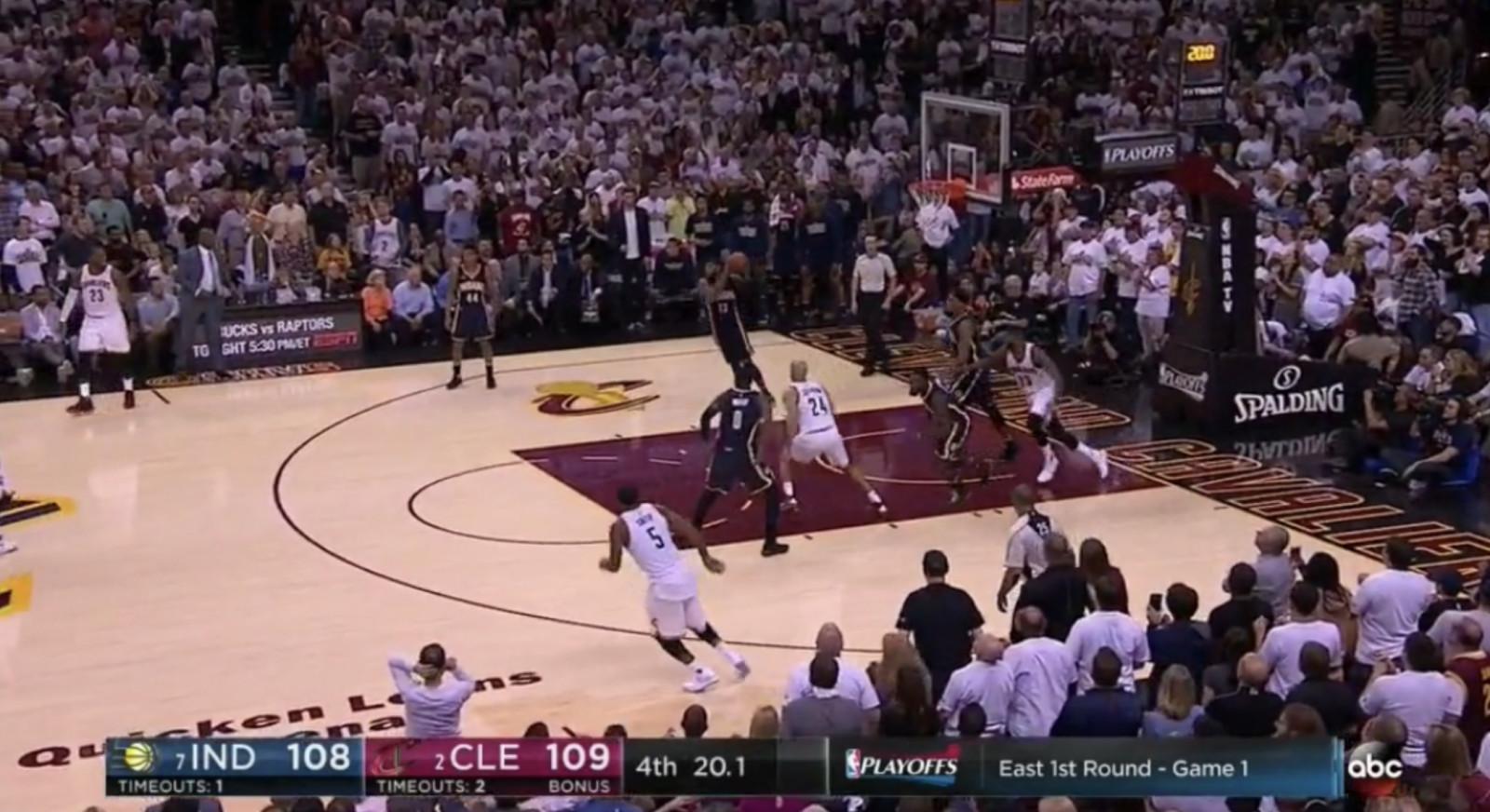 Paul George ripped down a rebound and was on the verge of racing up the floor with three Cavaliers defenders trailing behind the play. Maybe he sprints up past half court and there’s no play to be made, or maybe the Cavaliers fail to get back and he dunks the ball.