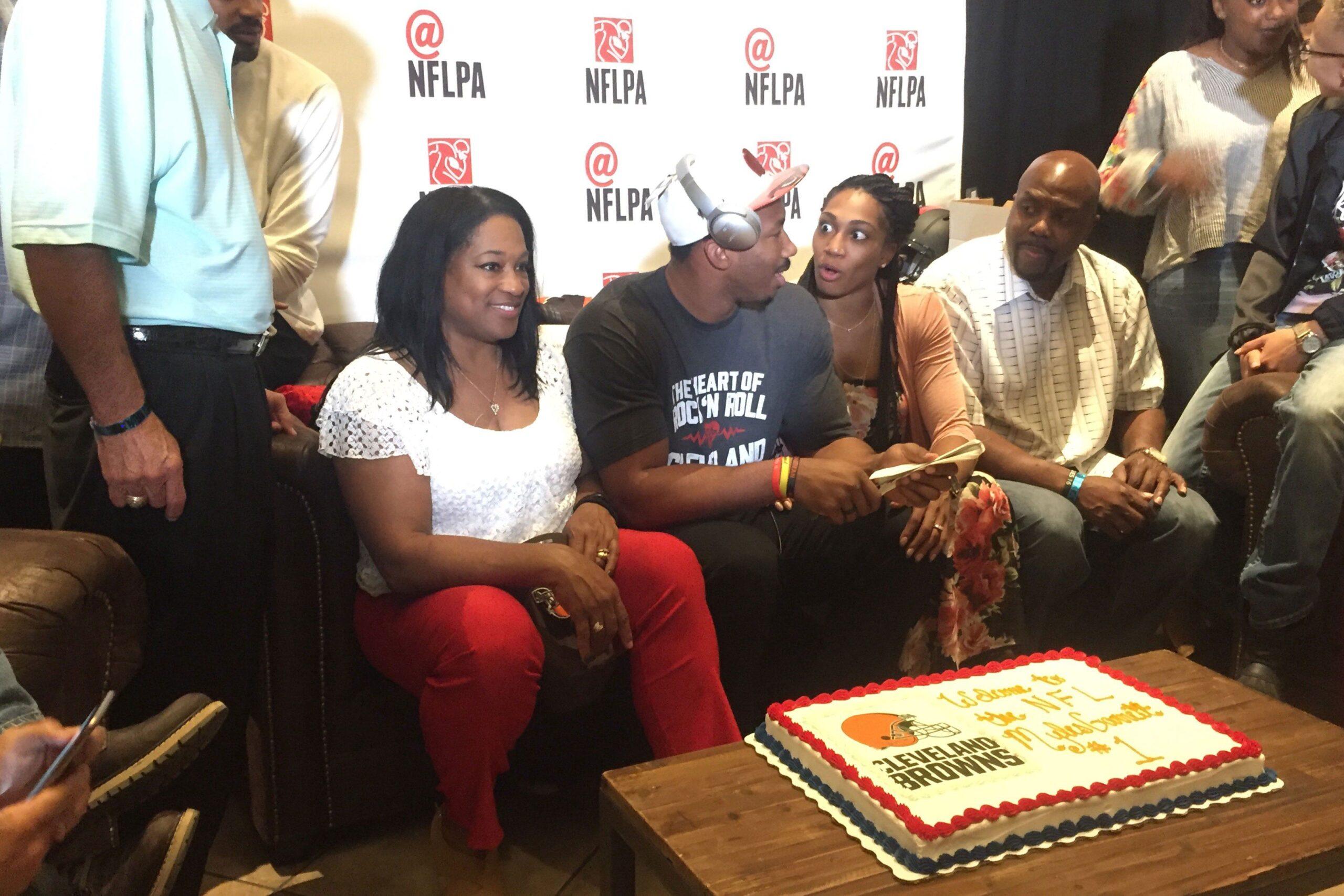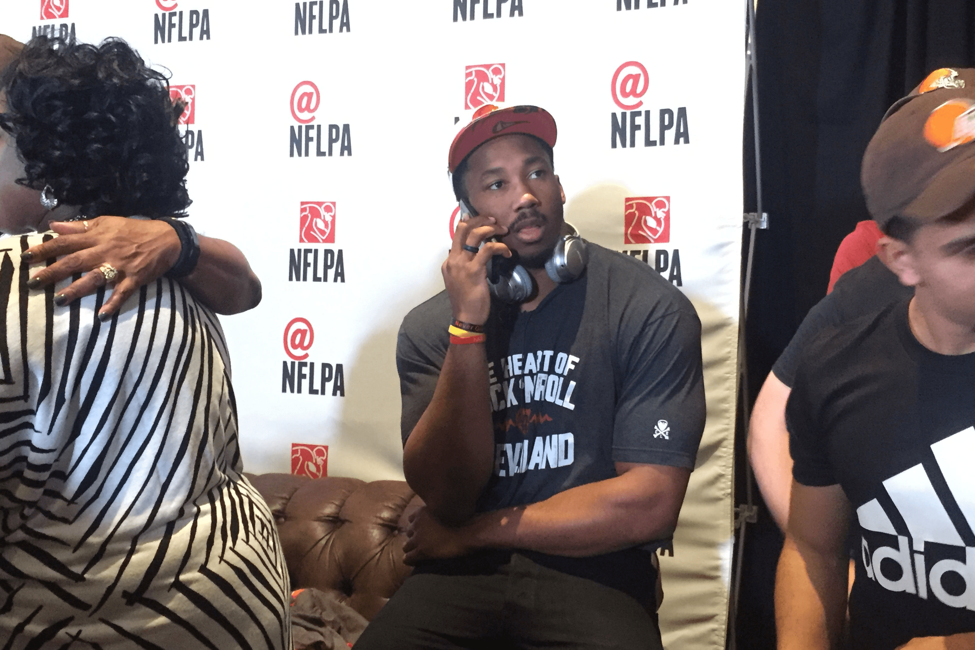 As the buzz of about 100 people in the roughly 1,000-square-foot room fades with nervous anticipation, the Garretts realize that there’s no sound coming from the specially installed 85-inch Aquos Sharp TV. Garrett’s mother, Audrey, needs the issue fixed, so she prods the event manager from the NFLPA, which is using its youngmedia arm at a draft party for the first time and aims to provide future prospects with a way to fully experience the draft even if they don’t attend. As Audrey directs the operation, NFL commissioner Roger Goodell puts the Browns on the clock and Garrett’s brother, Sean Williams, a former NBA player who’s sitting two couches to the left, mouths to Garrett, “You?” Garrett shrugs and whispers: “I hope.” Then, silence.