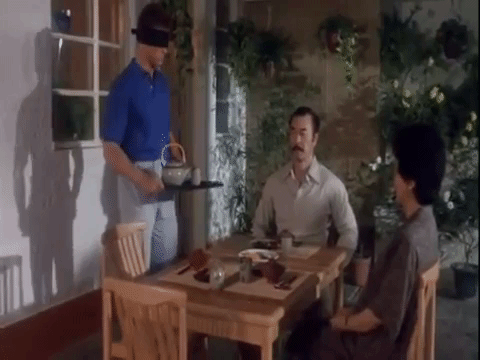 The Feats of Strength: The montage has some pretty standard stunts — it starts with an awesome repeated shot of Van Damme tumbling to the ground, and features the guy generally getting his ass beat by his trainer, Tanaka. But then Tanaka makes Dux serve him and his wife tea while blindfolded, which is just twisted and crazy and really, really hard!