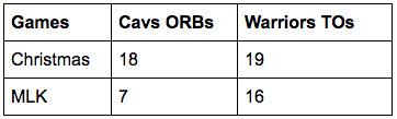 The two team statistics that told the tale in the regular season were offensive rebounds for Cleveland and turnovers for Golden State: