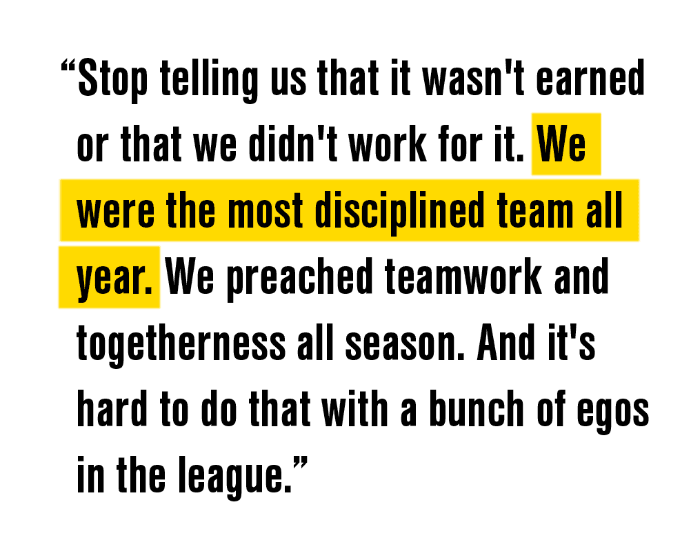 Durant: Yeah, we put in work, man. Stop telling us that it wasn’t earned or that we didn’t work for it. We were the most disciplined team all year. We preached teamwork and togetherness all season. And it’s hard to do that with a bunch of egos in the league.