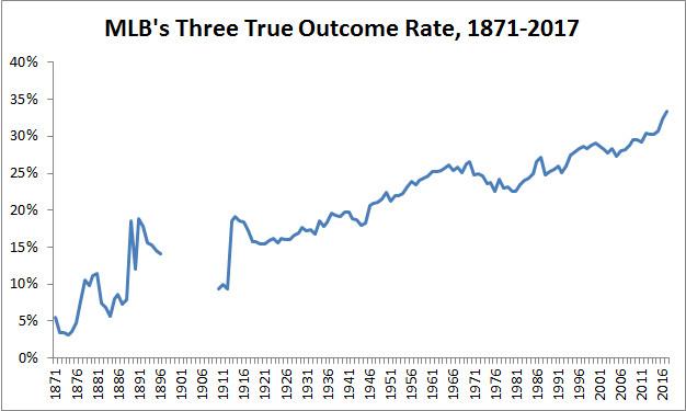 There are two ways to interpret that inclined line: (1) that this TTO-rate rise is inexorable and will eventually exterminate every ball in play, leading to the heat death of baseball; or (2) that the current trend is as old as the game, and that just as baseball has remained recognizably baseball throughout previous periods of increasing TTO rate, it remains recognizably baseball now.