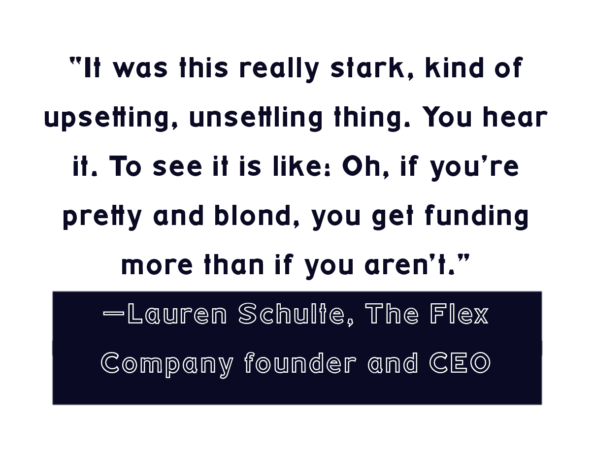 “It was so crazy walking in there because Erika and I looked at each other and we were like, ‘We’re all blonde,’” Schulte told me. “Most people were under 30. It was this really stark, kind of upsetting, unsettling thing. You hear it. To see it is like: Oh, if you’re pretty and blond, you get funding more than if you aren’t.”
