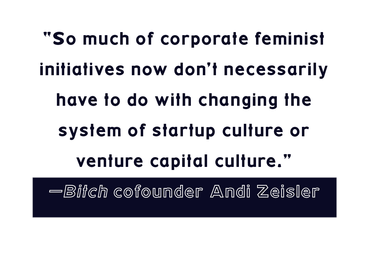 “So much of corporate feminist initiatives now don’t necessarily have to do with changing the system of startup culture or venture capital culture,” Bitch cofounder and We Were Feminists Once author Andi Zeisler told me. “They just have to do with women benefiting from those spaces and then sort of replicating the same corporate culture or power dynamics.”