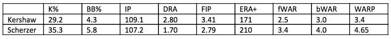 That’s not nothing, but it’s also not exactly what it looks like on the surface. First, 1.2 WAR isn’t that big a difference, and Scherzer’s whole lead is based on his performance this season. Second, unlike runs and strikeouts, which can be measured, WAR is a statistical model. A professor of mine used to say, “All models are wrong, but some models are useful.” Certainly WAR is useful, but it’s not a divine instrument — it only values what the people who designed it tell it to value. To reuse an old metaphor of my own, WAR is a roller and sometimes you need a brush — especially when you’re comparing just two players.