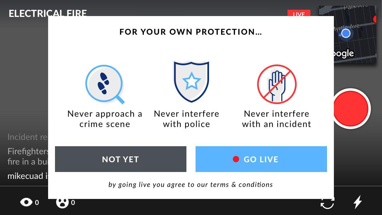 Since the app is trying to disassociate itself from vigilantism, I asked its maker if users now get banned for interfering with crimes. "If they violate the Terms of Service, they will be subject to being banned," a spokesperson told me via email. The terms of service state: "You are under no obligation to travel to or remain in any area during, before, or after a crime or other hazardous situation." Yet with Citizen alerting me to crimes right outside my window, according to the TOS, I should be banned from using the app simply for sitting in my room. The TOS is so sweeping that it could apply to anyone using the app, as the app prompts people to "safely" livestream crimes close to them — in other words, it appears there is no way to use the app in its livestreaming capacity without violating its terms of service.