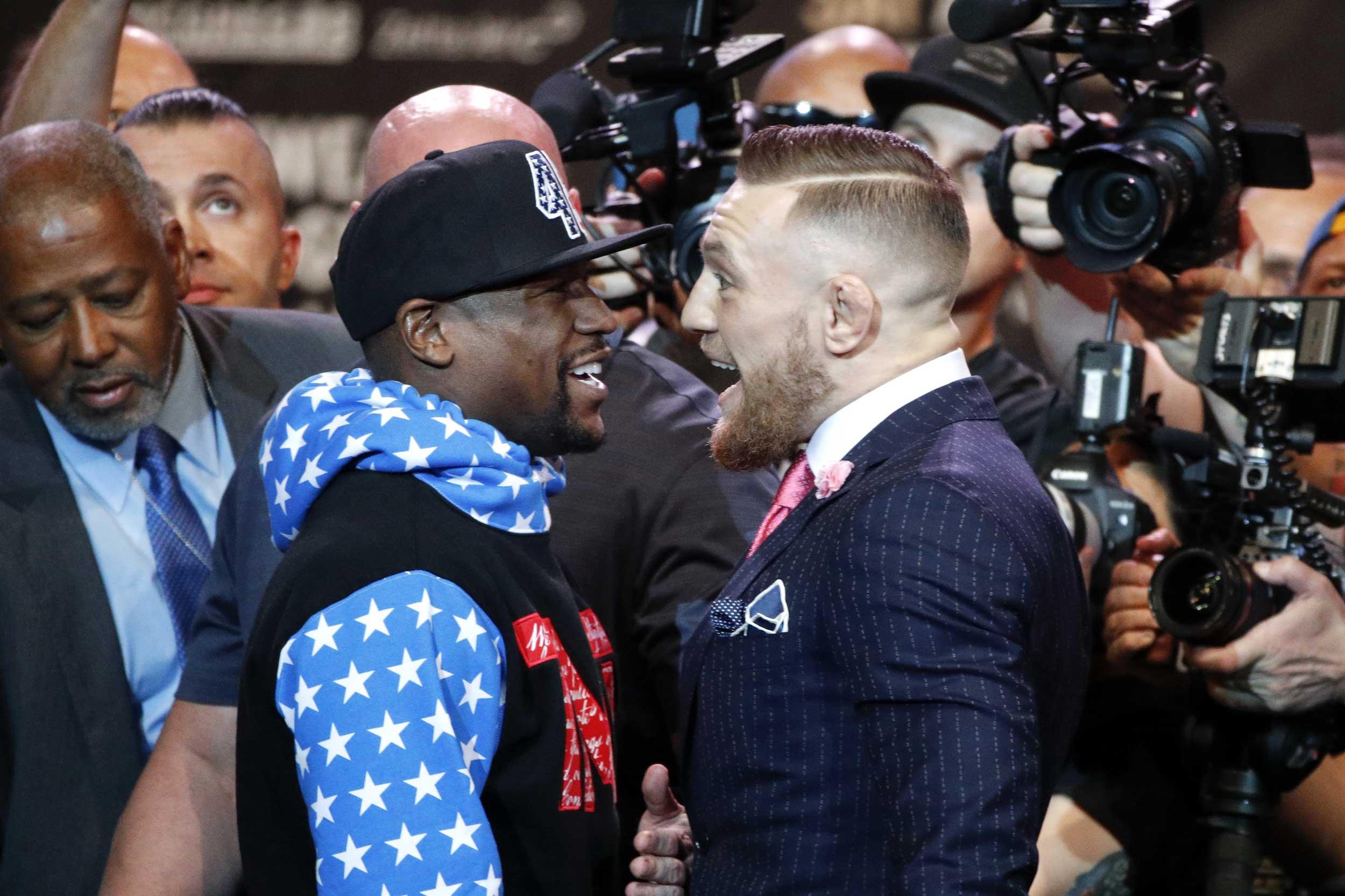 It wasn’t quite the "shit show" that UFC president Dana White predicted it would be, even if there were flashes when it was the kind of show in which circus dung was a key ingredient. By the time the tour reaches London on Friday, all bets are off, but on Tuesday the novelty of what Mauro Ranallo called "a once-in-a-lifetime happening" playing out in real time swept up the moment. There was McGregor (0–0), decked to the nines in a tailor-made suit, standing across from Mayweather (49–0), who wore a patriotic "TMT" hoodie. There they were — two record-breaking capitalists from different realms finally squaring off in a pre-war détente, staring into the money vaults of each other’s eyes.