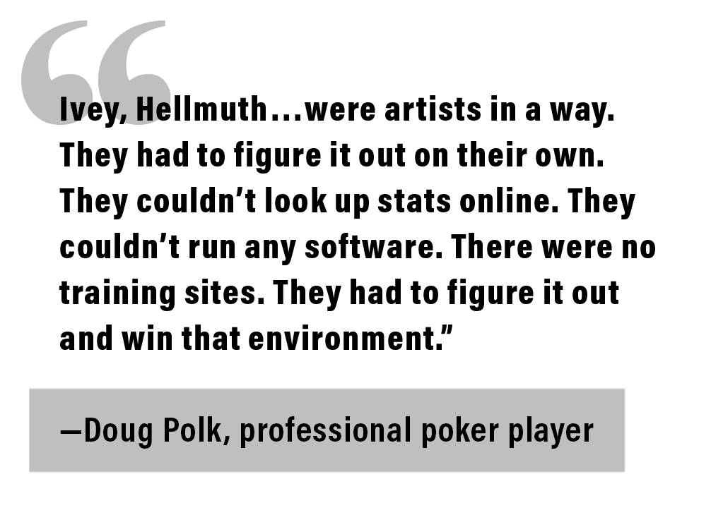 "Ivey, [Phil] Hellmuth, those guys, they were artists in a way," Polk says. "They had to figure it out on their own. They couldn’t look up stats online. They couldn’t run any software. There were no training sites. They had to figure it out and win that environment."