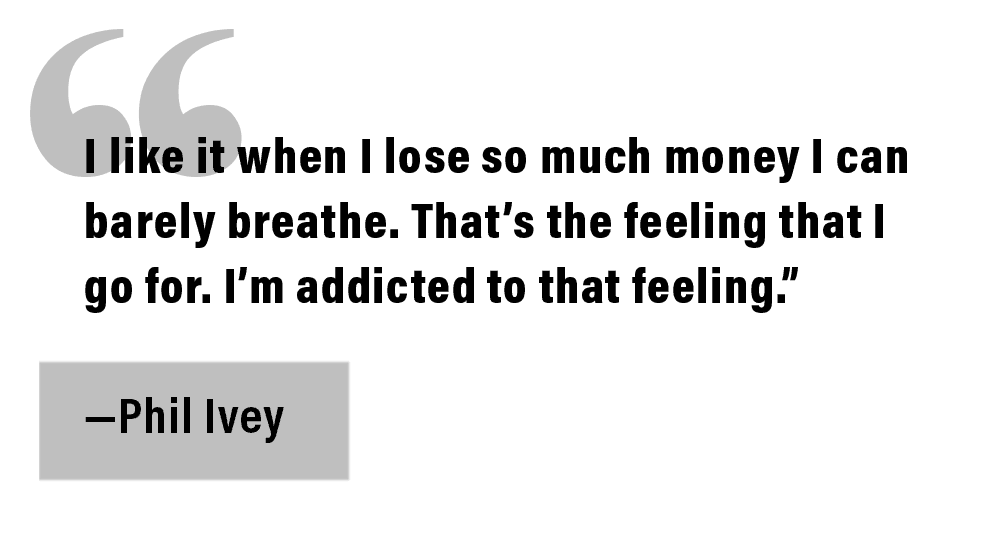 Later that year, Ivey was playing a cash game on the fifth season of the NBC show Poker After Dark. He and four other players repeatedly agreed to put $100,000 on the table and "flip" for it all by running out the cards to see who won. Ivey lost four straight flips. He laughed it off. He said he wouldn’t care if they flipped for $100,000 every two minutes. "I like it when I lose so much money I can barely breathe," he told the table. "That’s the feeling that I go for. I’m addicted to that feeling."