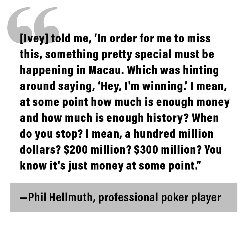 In the years after Black Friday, Ivey has spent less time in the high-limit poker rooms of Las Vegas. He has frequently popped up in Macau and Manila, where Malaysian gambler Paul Phua has organized high-stakes poker games the likes of which the world had never seen. Wealthy businessmen from all over the world would play in Phua’s game at stakes up to $12,500-$25,000, with stacks of millions of dollars in front of each of them. Most poker professionals were kept out of the games for fear they’d eat up all the money, hit and run. Ivey was one of the few pro players who was welcomed. Not because he wasn’t the best player in the world, but because Ivey knew how to give action. He knew how to keep a game going. And because he was a singular poker celebrity. His presence in the game would attract players. Ivey was good for business.