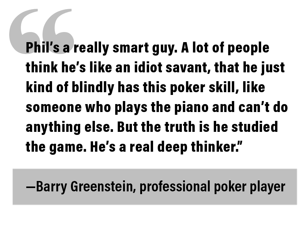 "Phil’s a really smart guy," says Barry Greenstein. "A lot of people think he’s like an idiot savant, that he just kind of blindly has this poker skill, like someone who plays the piano and can’t do anything else. But the truth is he studied the game. He’s a real deep thinker."