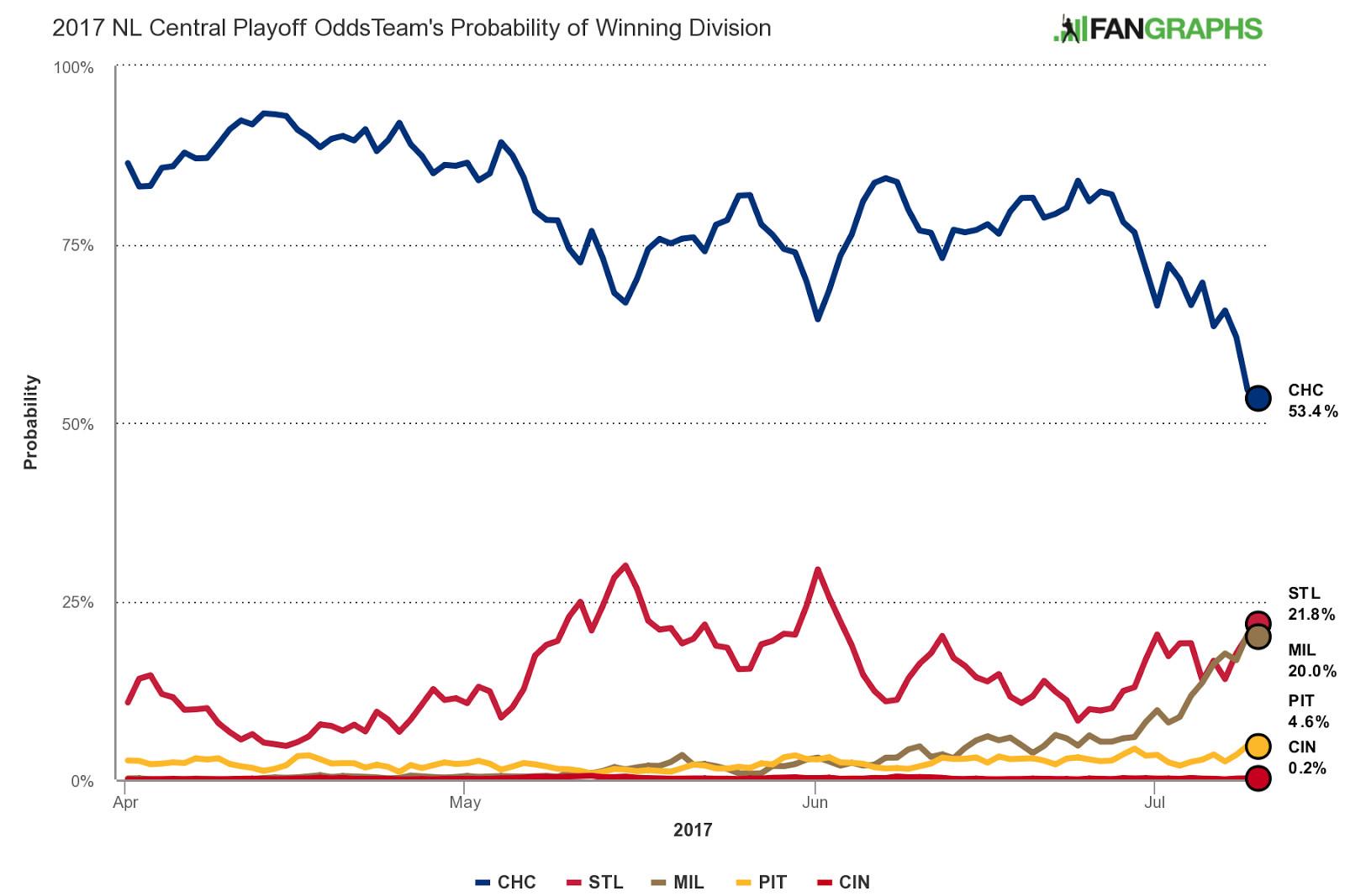 Jack McCluskey: The advanced numbers are very much against this, I know. FanGraphs gives the 50–41 Brewers a 20.6 percent chance at winning the division, a 9.7 percent shot at the wild card, and just 30.3 percent playoff odds overall.