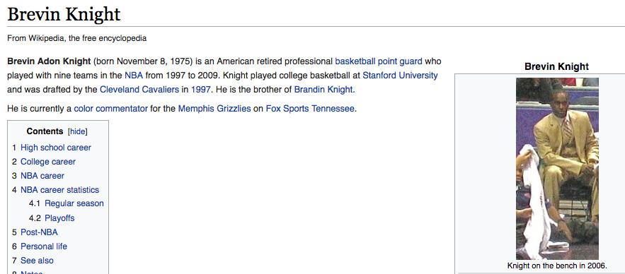 Some NBA Wikipedia photos are as distant, grainy, and ugly as something I could take on my iPhone. Some come from the instances when fans run into players off the court and snap shots then. (Here is Darius Miles, and here is the uncropped photo of Darius Miles with a guy giving two thumbs up that will represent Miles for the foreseeable future.) This Wiki photo problem is an issue for a handful of current NBA players — such as Taj Gibson, Wilson Chandler, and Dahntay Jones — but the most doomed players are those who retired a short time ago, after it became feasible for people to bring cameras to games and upload pictures online, but before Wikipedia users recognized the need for high-quality photos on each page.