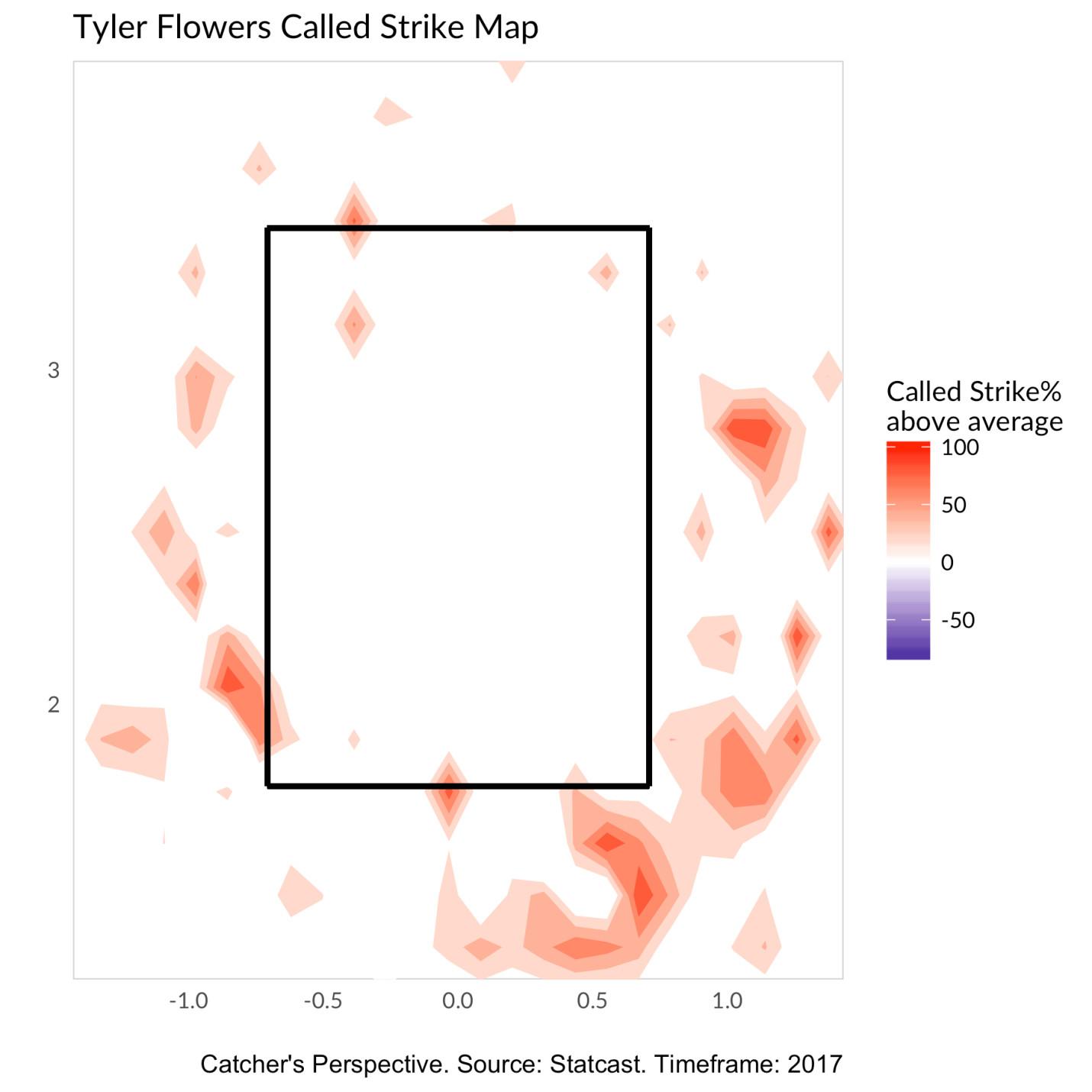 His hottest spot has actually been outside the zone, right where Davis went down. "There is some basic logic that I think a lot of catchers miss," Flowers says. "The deeper you catch that ball, the more it appears to be off the plate away. The further out in front you can catch that ball, the appearance of the pitch seems to be more towards the plate and the break seems to be smaller. … If I let it get in between my legs, the appearance could be another 6 inches lower, versus if I catch it as I’m extending my arm out in front of me."