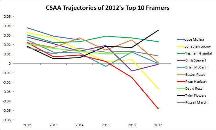 Flowers alone seems immune to the trend toward more modest framing values. The graph below tracks the yearly Called Strikes Above Average rates of the top 10 framing catchers from 2012 (min. 2,500 chances), Flowers included.