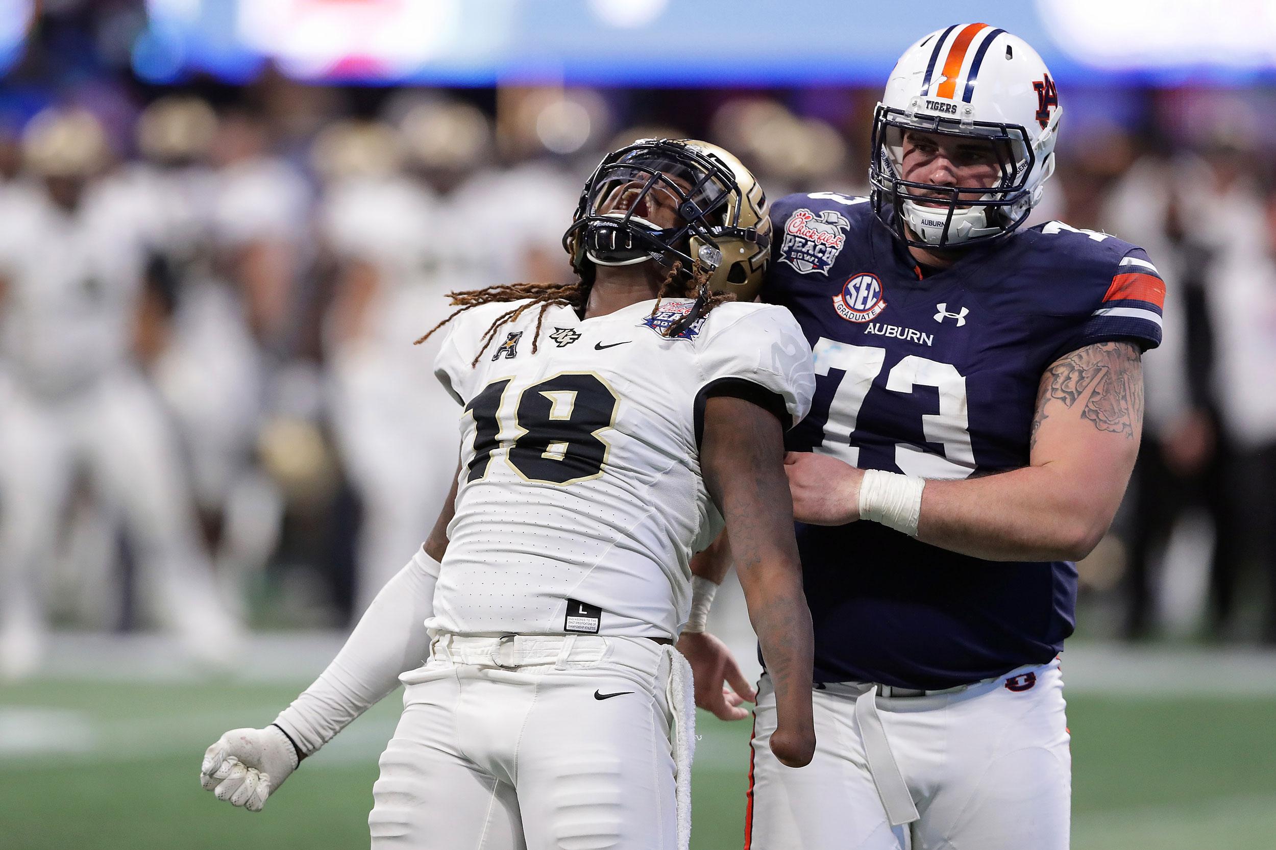I love UCF’s defense, led by redshirt senior Shaquem Griffin. The linebacker single-handedly recorded 12 tackles against Auburn, including 3.5 for loss with 1.5 sacks. (Single-handedly because he has only one hand. He was better than all of the two-handed players on the field Monday.)