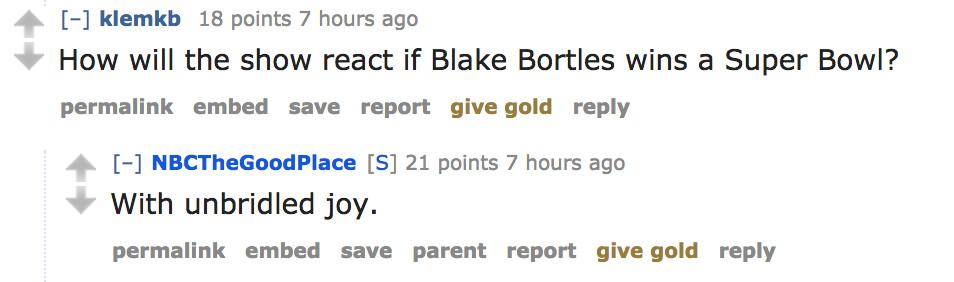 “You couldn’t stop talking about … that dumb quarterback,” Michael says to Jason. “What’s his name? Derek Bortles? Always ranting about Derek Bortles. Lucky for you, my friend, Jaguars games are the only ones televised in the Bad Place because THEY SUUUUUUUCKKKKK.”’