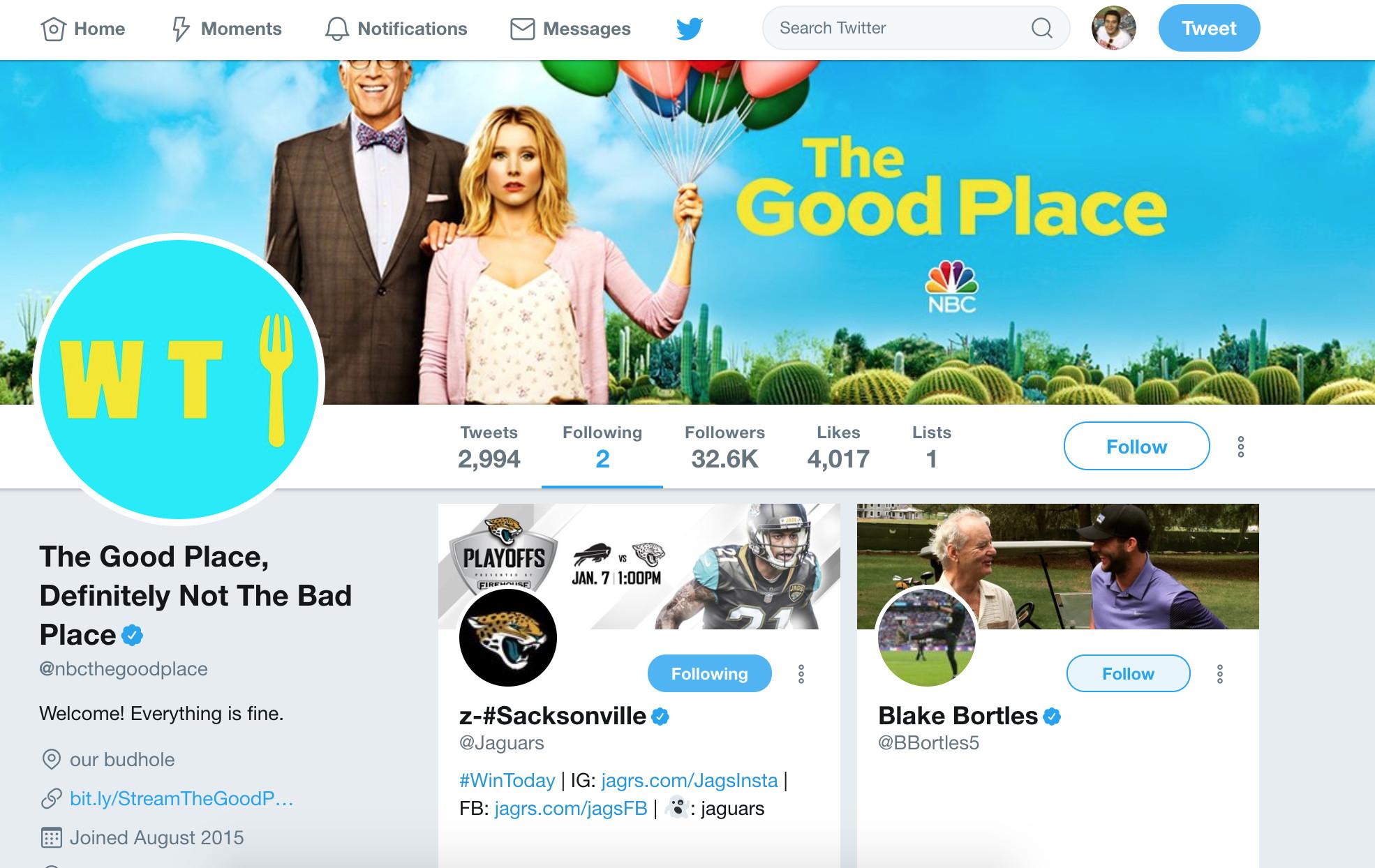 Of all the twists in the show, the most shocking is that Jason was exactly right. While The Good Place was on break, the Jaguars finished the 2017 season 10-6—double their highest win total from the past six years—and won the division for the first time since 1999. On defense, they allowed the second-fewest total yards and second-fewest points scored. On offense, they were fifth in points scored, sixth in total yards, and first in rushing. Blake Bortles, a human punch line who’s been mocked by pundits, opponents, teammates, and even Ted Cruz, has been competent. Now the Jaguars are hosting a playoff game for the first time this century, just two days after The Good Place returned and made an actual plot point out of making fun of Bortles’s name.