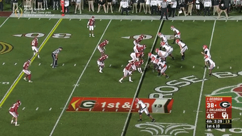 At times, the game did expose Fromm’s youthful inexperience. He was flagged for a baffling intentional grounding penalty early in the fourth quarter with the Bulldogs clinging to a 38-31 lead, a pivotal moment in which Fromm tried to shovel the ball to an nonexistent receiver before getting swarmed by a duo of Oklahoma defenders.