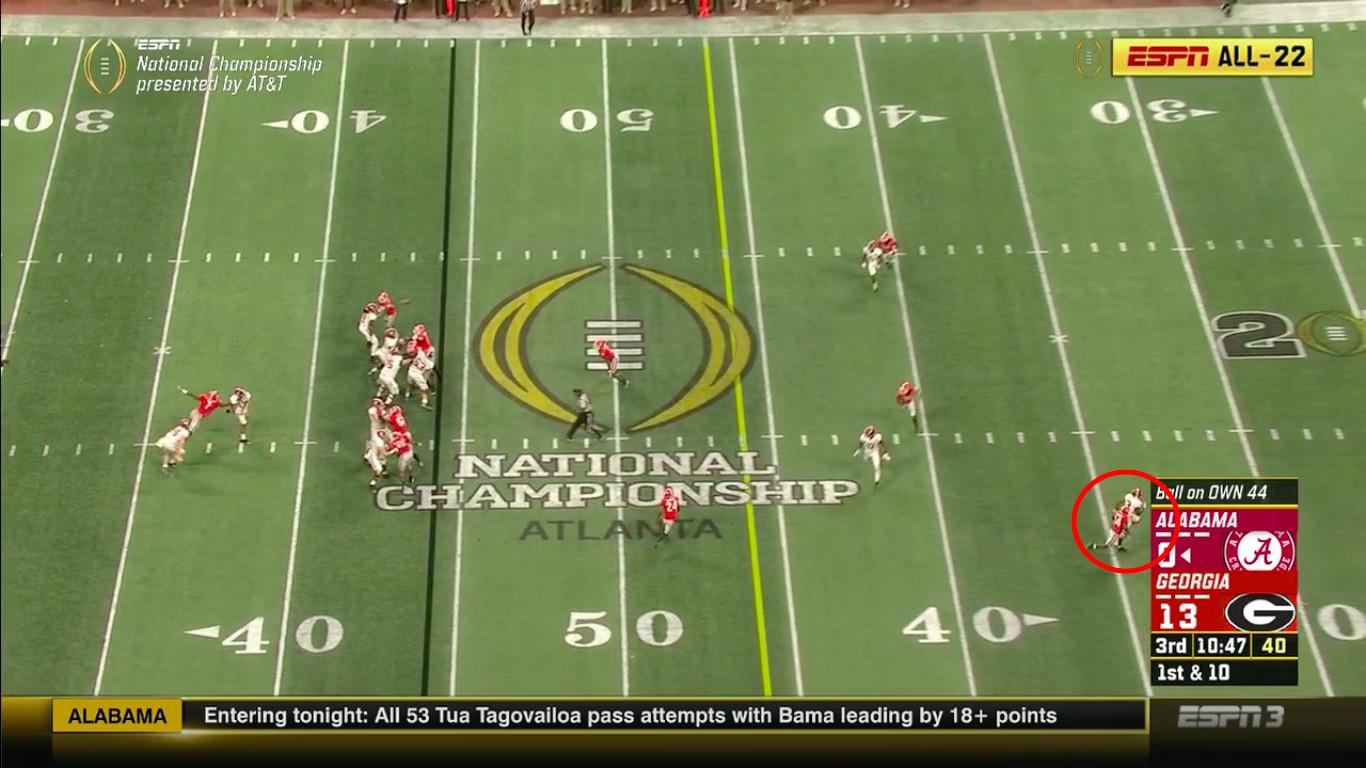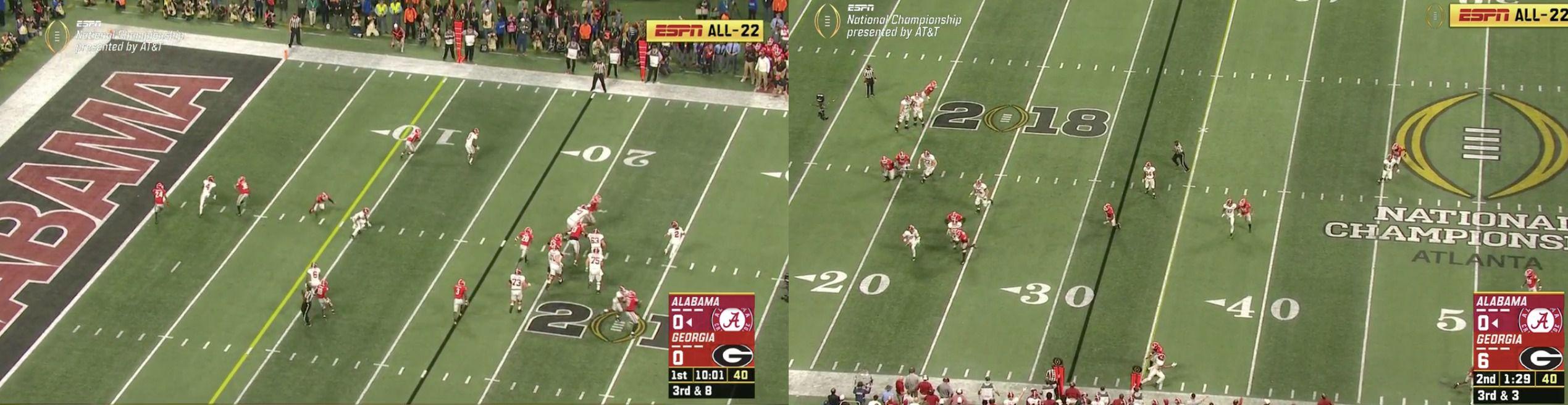 The Tide rarely sent receivers deep, and when they did, Hurts was not capable of throwing to them. By looking at the below screenshots, it’s easy to see how different Bama’s plays were when Tagovailoa was in the game:
