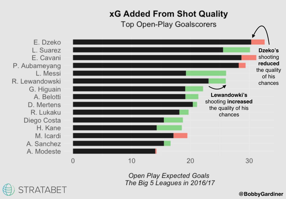 For some of the players with fewer chances overall, the quality of their shots may have defined their seasons. Federico Bernardeschi was signed from Fiorentina by Juventus for €40 million in the summer, as he scored seven open-play goals rather than the three implied by a chance quality model because of his finishing. But for players like Cavani, who lost three xG from the quality of his shots but nonetheless scored 27 open-play goals, the chances themselves are far more important.
