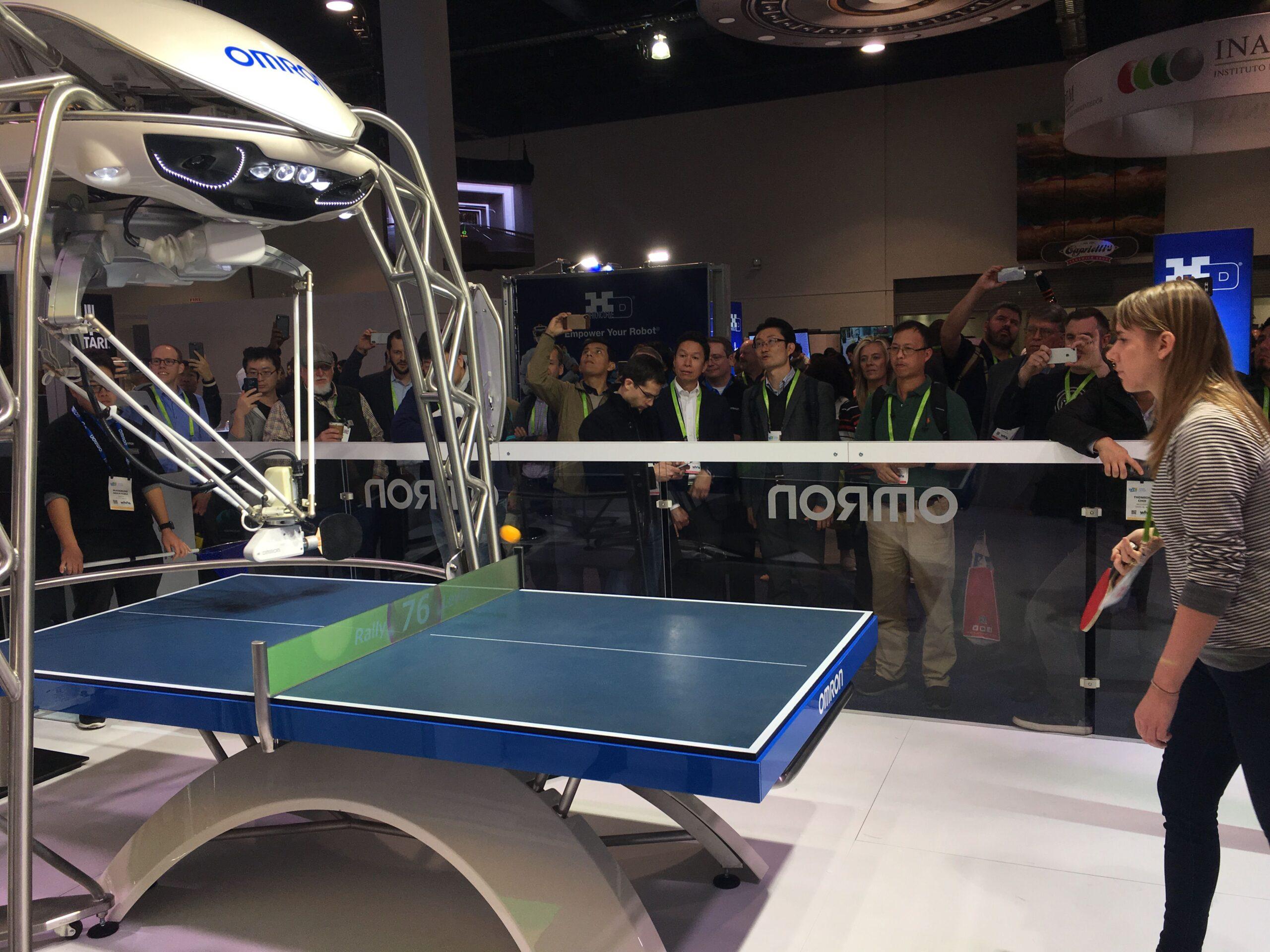 The culmination of my comparison tour took place at the Omron booth, where a handful of NFL players had appeared to challenge a hulking, spider-like machine to a game of ping-pong. Much like IVS, this setup was a way for a manufacturing-focused company to involve curious attendees. “We were looking for a way to demonstrate artificial intelligence, robotics, sensing, and control, but do it in a way that interacts with people,” Omron marketing manager Keith Kersten told me as I signed up to play. The more I learned, the more my questions for Kersten were directed at sizing up my competitor.