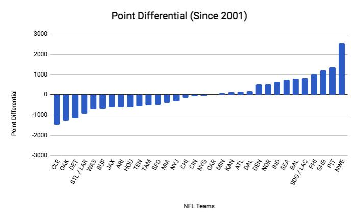 The Pats have lapped every team in point differential except Seattle, and their figure is three times (!) that of the sixth-place Saints (plus-371). (Also, shout-out to the Browns for being last in both of these charts, but still not nearly as bad as New England is good.)