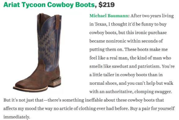 Bereznak: Baumann is secretly in the pocket of Big Cowboy Boot. Exhibit A, from our “Best Things We Bought This Year” post.