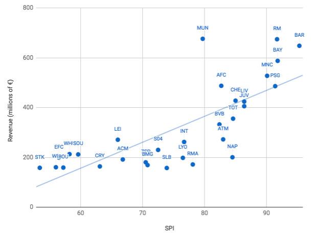 Here’s the top 30 of the Money League, plotted against FiveThirtyEight’s SPI, which rates the underlying quality of a team: