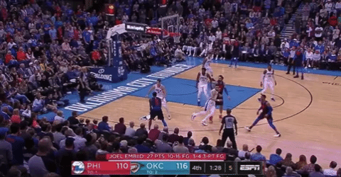 Jerami Grant will likely see the biggest boost in playing time; he played the last 6:25 of the fourth quarter Sunday with the other four starters. At 6-foot-9 and 220 pounds with a 7-foot-2 wingspan, Grant is bigger and longer than Roberson and has the athleticism to match up with players at all five positions. Like Roberson, he’s an inconsistent 3-point shooter (24.6 percent from 3 on 1.4 attempts per game this season), but he’s more capable of putting the ball on the floor, making plays off the dribble, and threatening the defense when he’s not in the paint. Grant mostly stayed out of the way on offense during Oklahoma City’s 21–9 run to close out Philadelphia, but he made plays Roberson never could, like this drive on Dario Saric:
