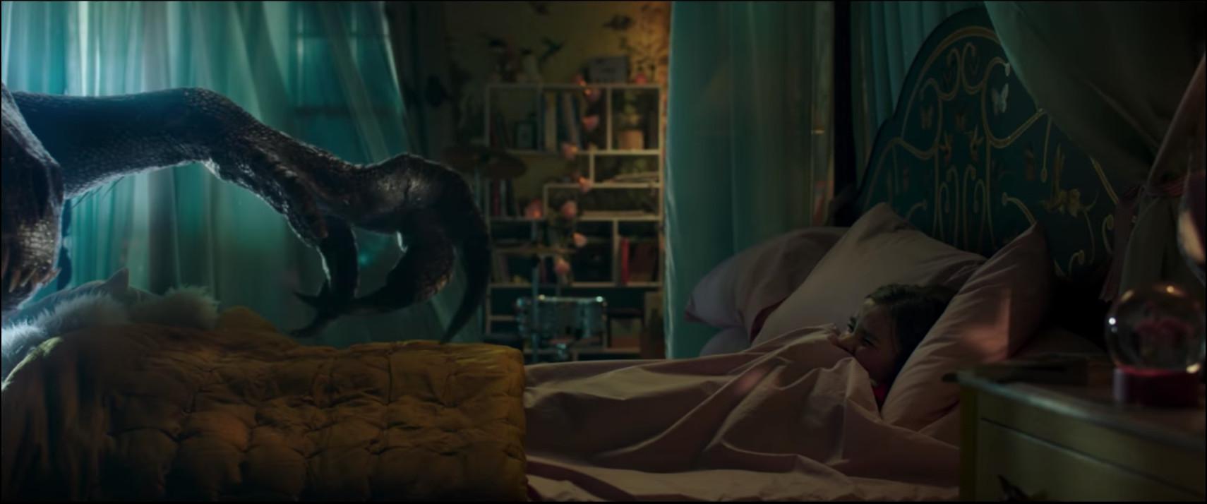 If the first trailer for Jurassic World: Fallen Kingdom felt like it was leading to nowhere—a volcano is destroyed the island and dinosaurs were literally jumping into the water alongside Chris Pratt—the Super Bowl teaser clears some things up. It appears the action will eventually make its way stateside, where another lab-concocted dino-hybrid, similar to Jurassic World’s Indominus rex, is wreaking havoc. However, how this new dinosaur makes its way to a child’s bedroom is, uh, less clear.
