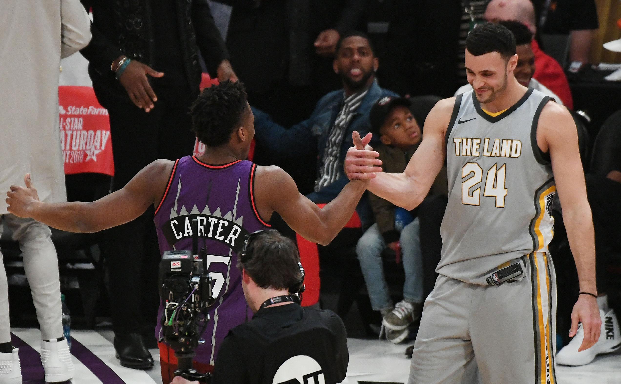 Aside from the Dennis Smith Jr. snub, which we’ll get to in a moment, the final round of the championship matchup between Larry Nance Jr. and Donovan Mitchell was everything a dunk contest should be. Nance started it with a ridiculous double pass off the backboard that was as impressive as it was creative. Inside the Staples Center, an average cheer arose when Nance finished the dunk—then he pointed to the instant-replay screen to explain what just happened. Fans, judges, and fellow players quickly realized what exactly he had done, and the second, delayed cheer was even louder and far more appropriate for a never-before-seen dunk. Nance got a 50.