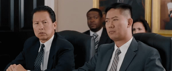 In this particular scene, the company that he works for is trying to negotiate a merger with another company. He’s just walked into the meeting late (it’s the Ryan Reynolds version of him, and so he’s kind of screwing everything up), and when he does, everyone starts firing questions at him about various technical parts of the merger.