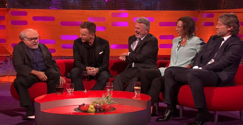 Here is a photo of Danny DeVito showing Ewan McGregor, Sam Neill, Miranda Hart, and John Bishop exactly where in the crotch he was bitten by a monkey: