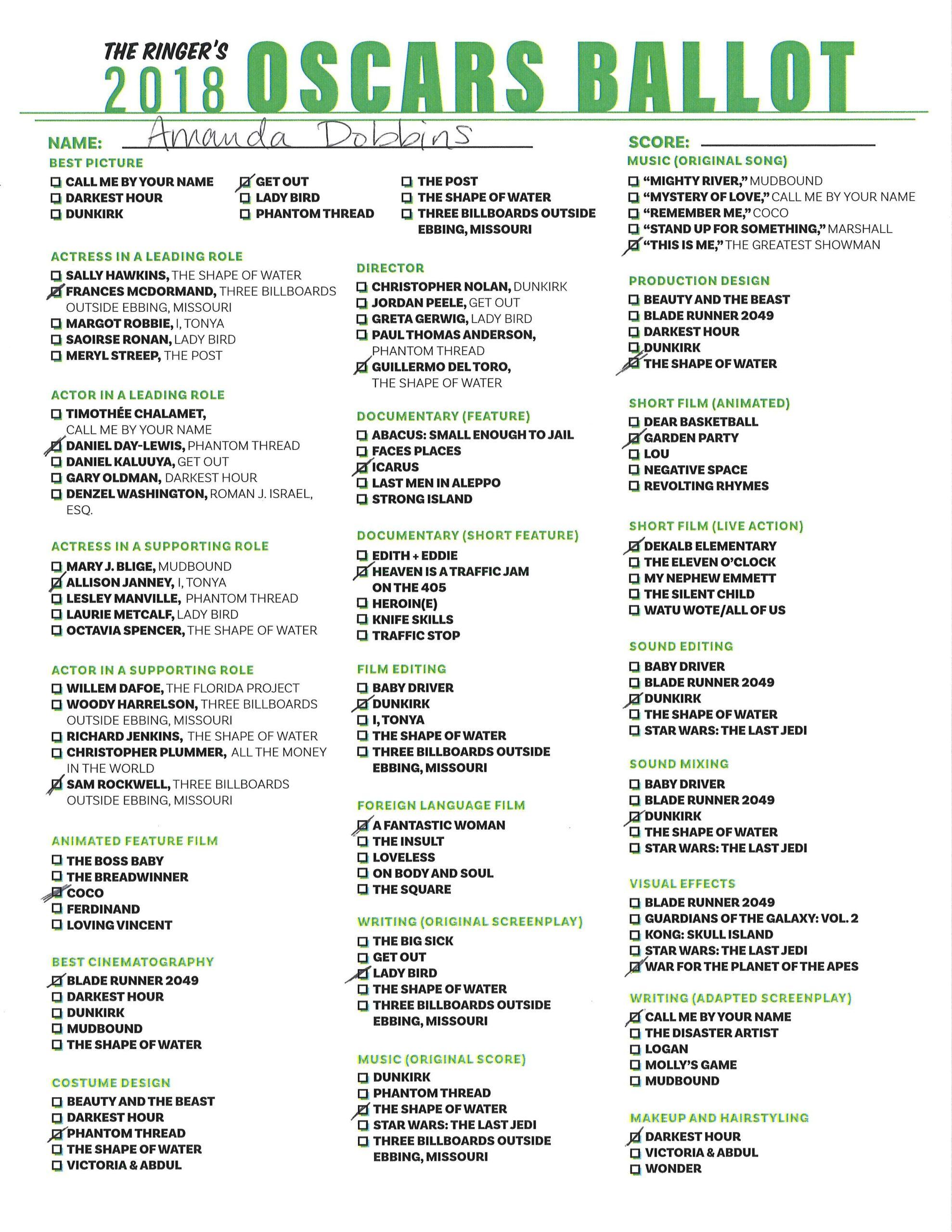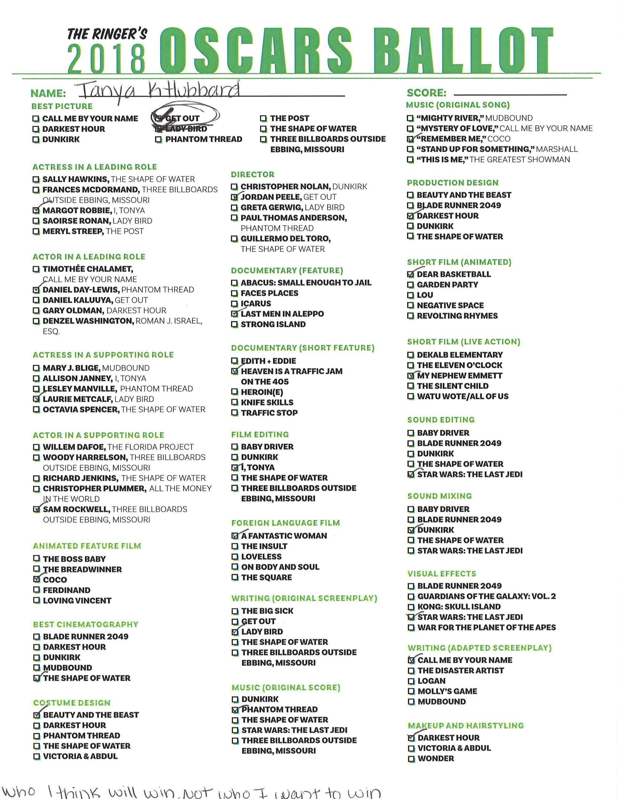 Filling out an Oscar ballot can be maddening: The “should wins” are seldom the “will wins.” We know deep down that the acting performances and films that we treasure the most shouldn’t get a check mark next to them (sorry, Laurie Metcalf) and resign ourselves to selecting the odds-on favorites (congrats, Allison Janney!) With that in mind, here are the Ringer staff’s official predictions for the 2018 Academy Awards. Can the fish sex movie really win Best Picture? Do Dunkirk’s sound mixing and editing reign supreme? Will Lady Bird be honored with any statuettes at all? Let’s go!