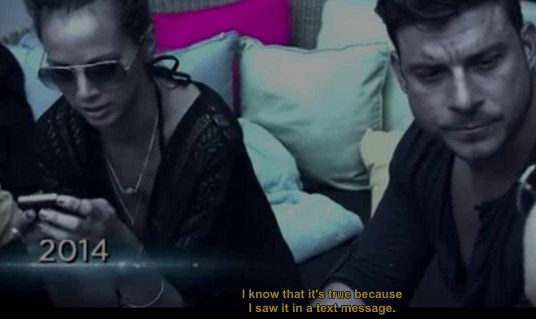 The above example is one of the many times VPR gives us a nice, clear view of a text thread. I live for those; here’s another great instance from Season 5, when Scheana texts Kristen a novel about how she’s ignoring Lala out of loyalty to Katie. It’s great because it includes unaired information about how James, the resident British DJ, was too drunk to get on a plane (and also how Scheana is going to work on her “roll ups,” insider SUR lingo for the way they roll up silverware in napkins, the process that serves as a setting for many on-air gossip sessions). Also, yeesh, put that phone on battery-saving mode, Kristen.