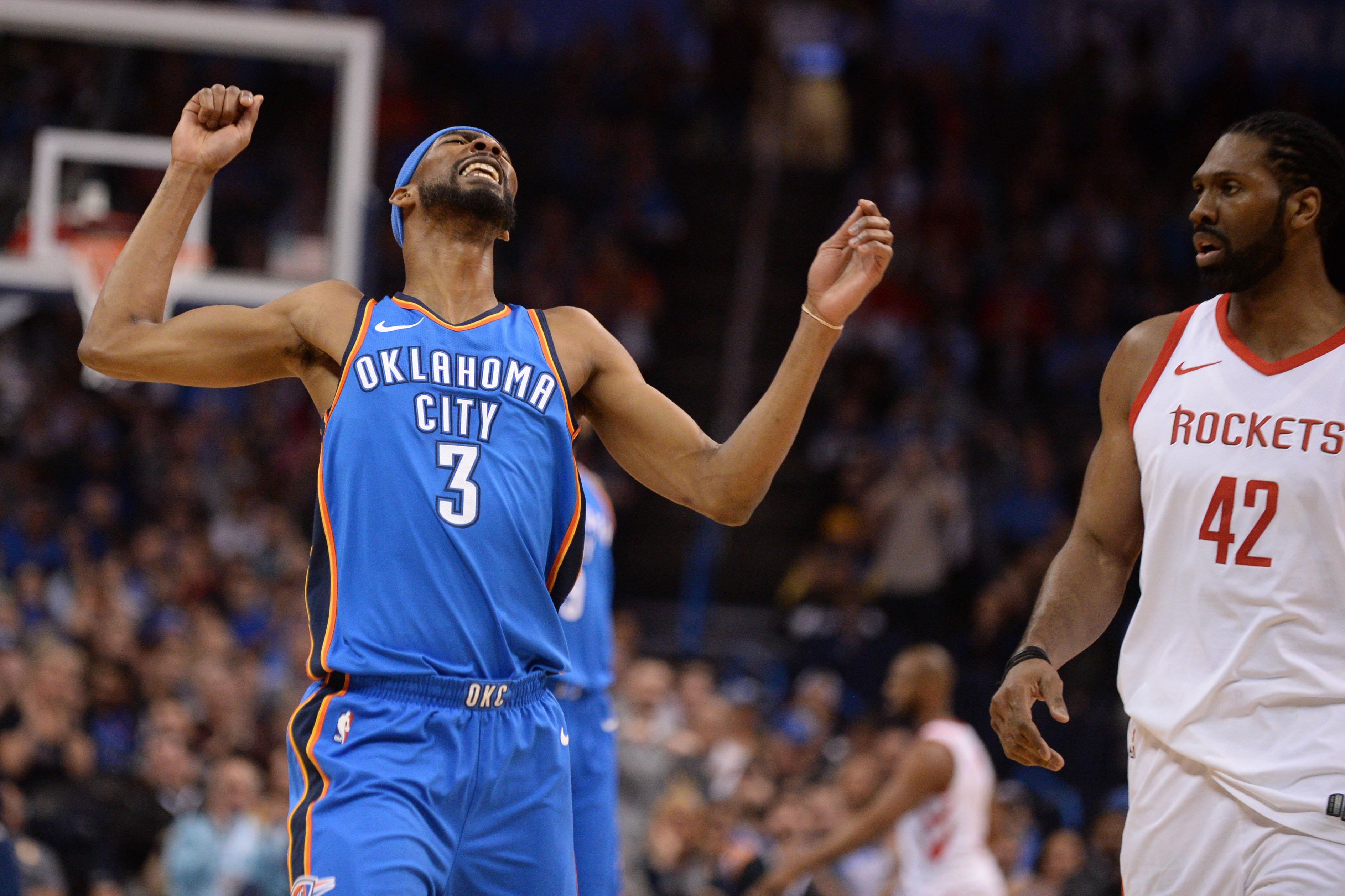 Late in the third quarter of Rockets-Thunder, James Harden drove past Carmelo Anthony on the perimeter like he was swerving around a traffic cone on the road. Harden finished the layup. Melo, who was made an impromptu statue on the floor of Chesapeake Energy Arena, was enraged. He screamed at Steven Adams, asking him where the help was. The problem? Harden was too fast for the help to even begin rotating. Melo was burned. Adams pointed to a frustrated Paul George, and that about summed up OKC’s night. Houston won 122-112.