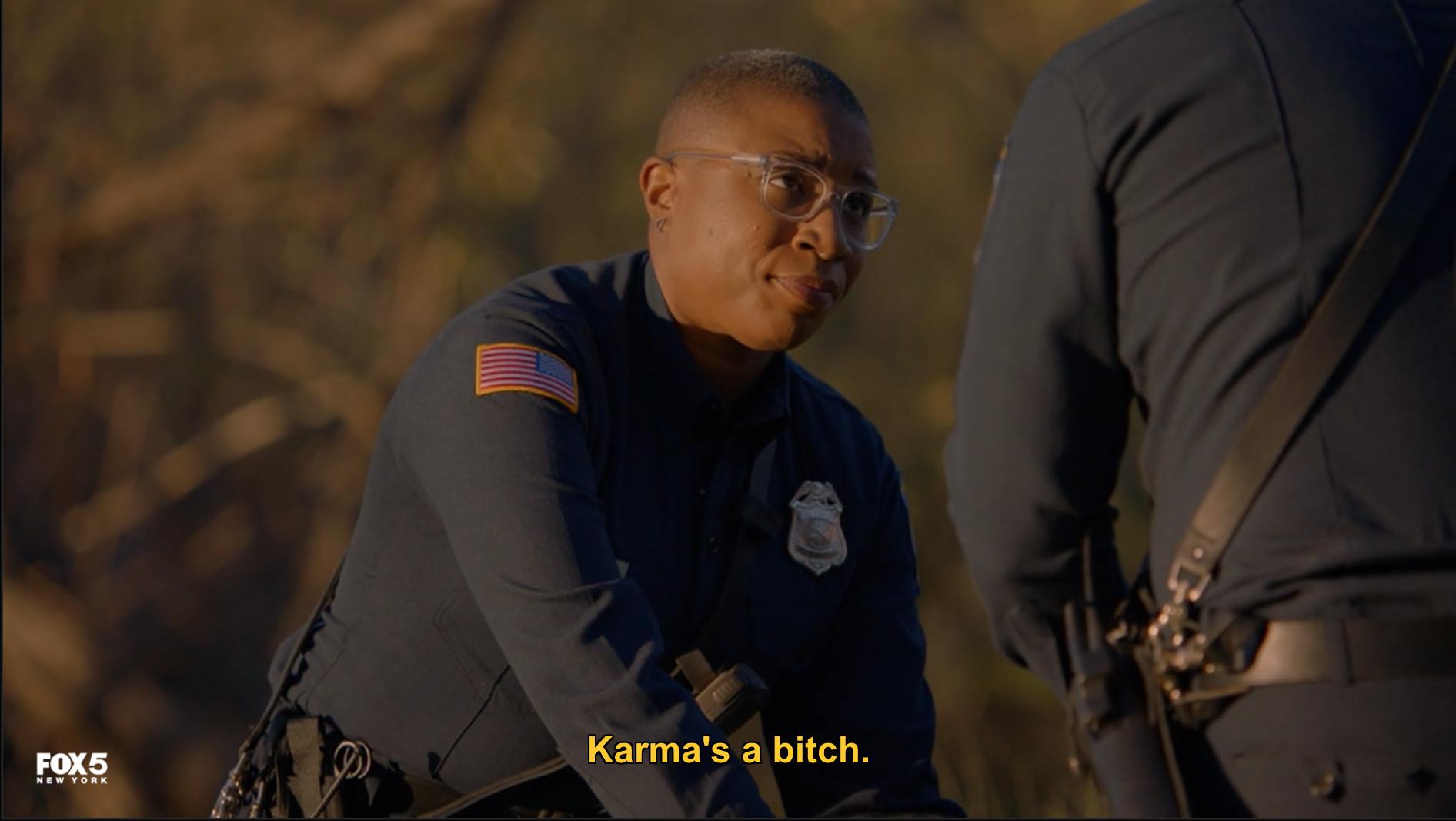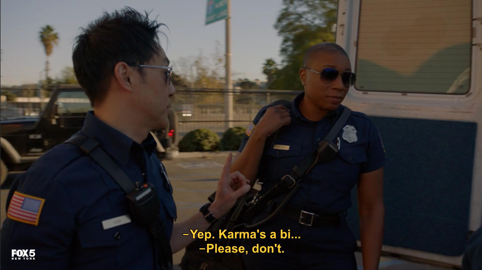 I should’ve known going into Wednesday night’s episode, quite unsubtly titled “Karma’s a Bitch,” that karmic justice would hit this show with the loudest of thuds; that characters would explain the concept of karma as if nobody’s ever heard of the word before; that the actual line “karma’s a bitch” would be uttered several times; that the karma enacted would be so on the nose I’d become convinced that 9-1-1 exists in a surrealist, heightened reality where unseen gods treat humans like pawns to mess around with—especially those who respond to emergency calls for a living.