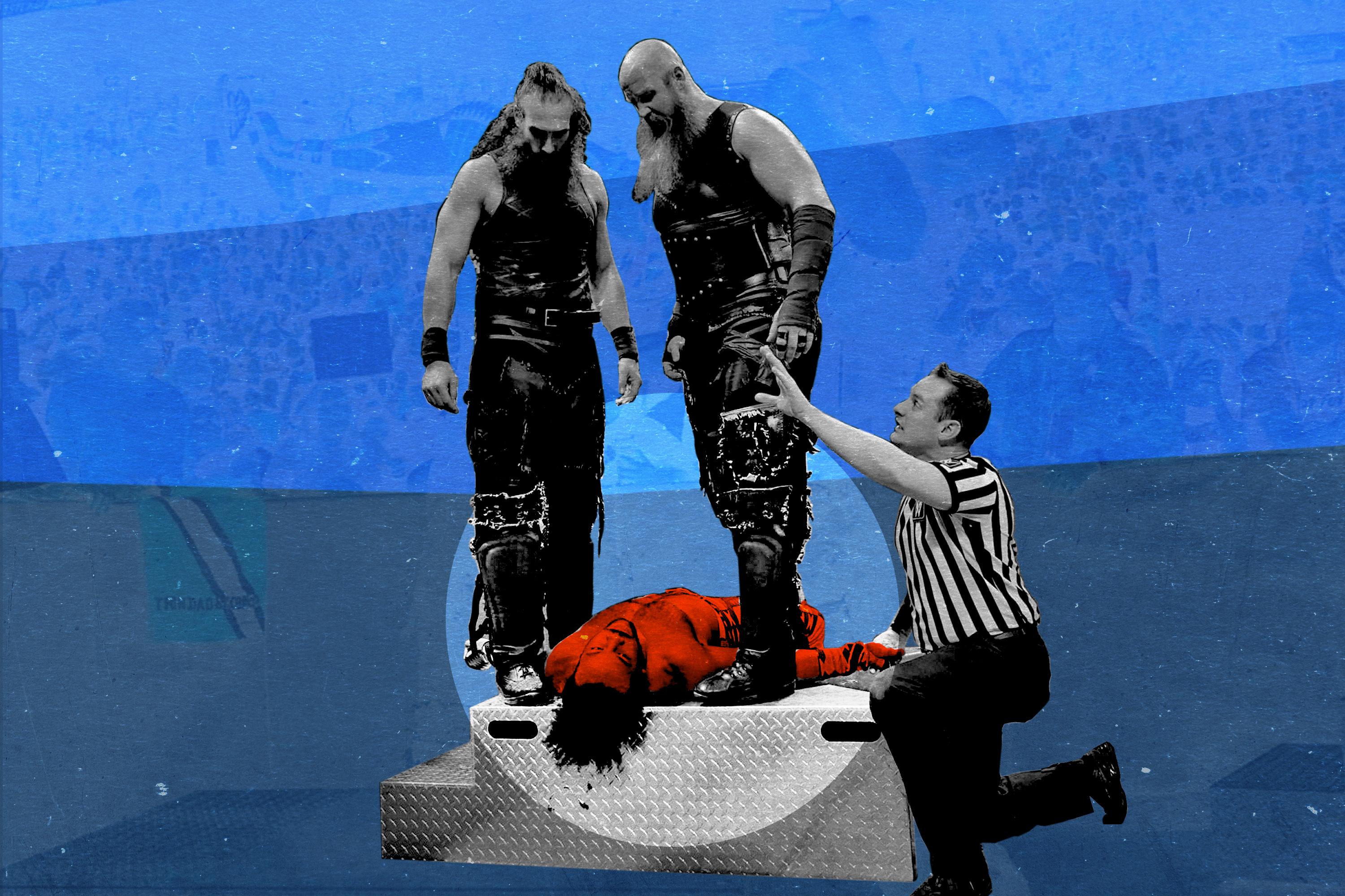 Here, Harper and Rowan appear to be rescuing Woods from a coal mine. But this is not a volunteer effort. As the fans’ collective gasp indicates, the duo is positioning its foe for an elaborately staged moment of destruction, despite having demonstrated the swift efficiency of their stadium-concession mallets. “You won’t do it!” yells the man in red, either egging them on or enunciating his own denial.