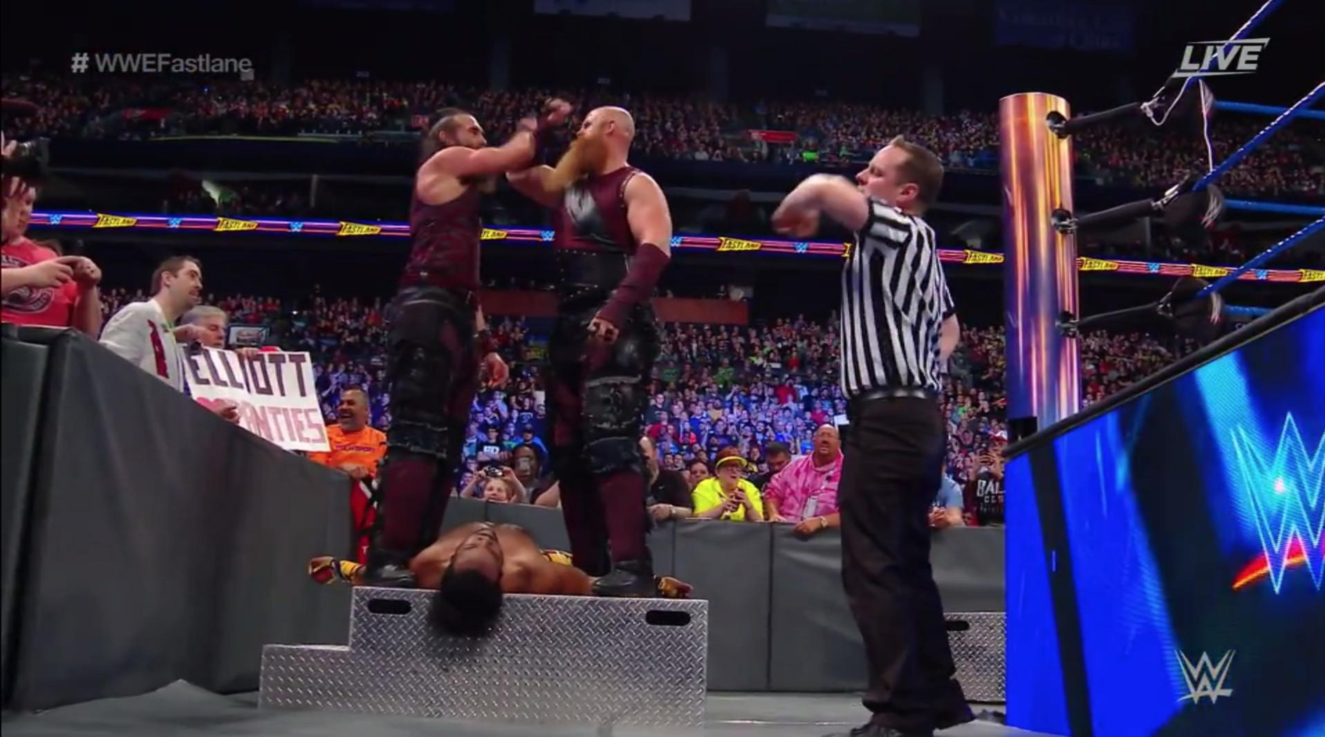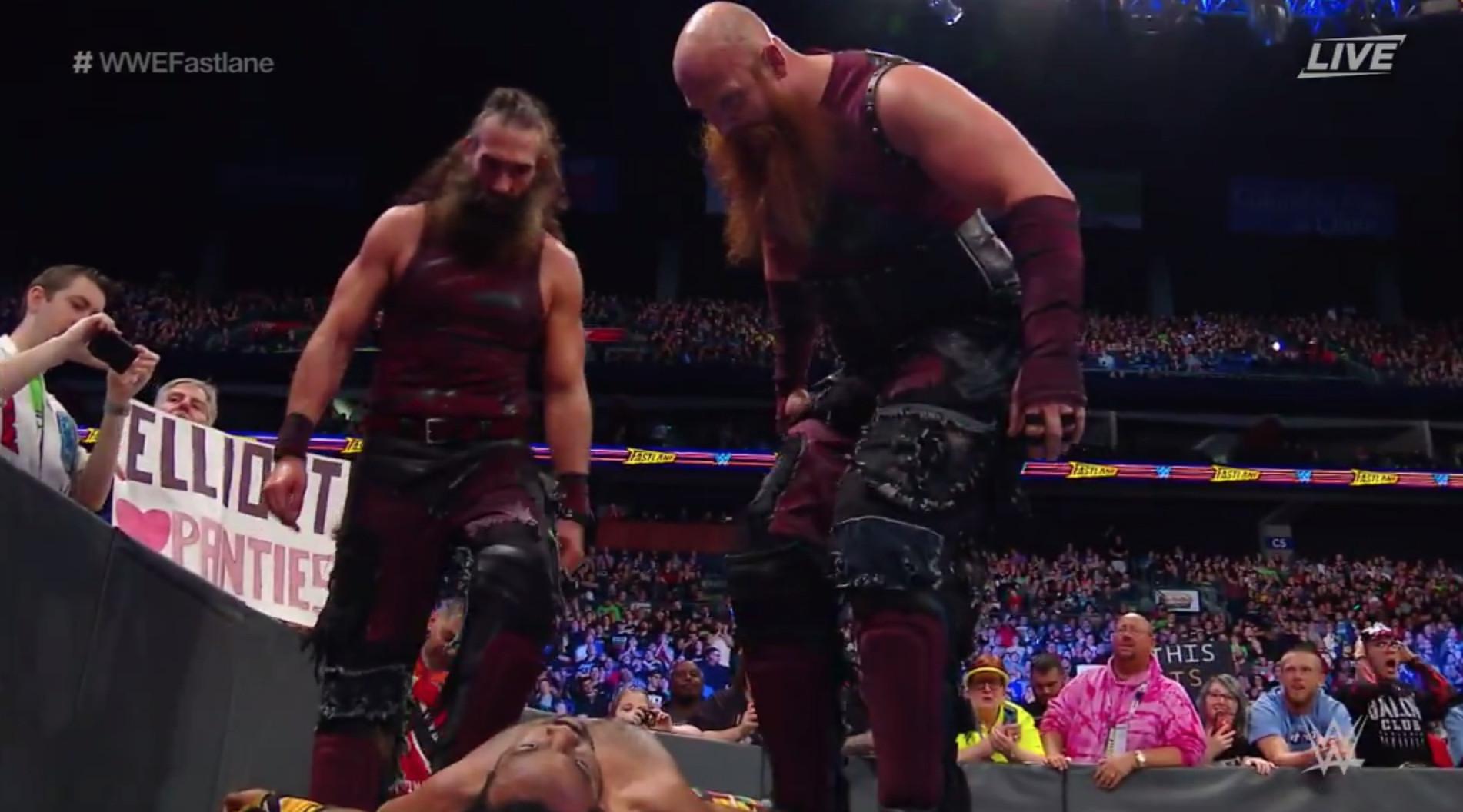 After all that buildup, the concluding chapter in New Day and the Usos’ grudgingly respectful rivalry turned out to be a glorified showcase for the Bludgeon Brothers’ WrestleMania push. On Sunday, in the midst of Fastlane’s tag-title tussle — featuring New Day’s Kofi Kingston and Xavier Woods vying for Jimmy and Jey Uso’s belts — Luke Harper and Erick Rowan ran interference on the lot of them, prompting a no-contest and culminating in a vicious powerbomb thudding Woods atop the ringside steel stairs.