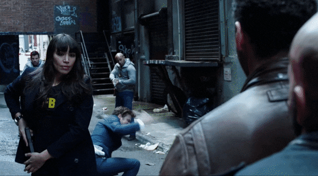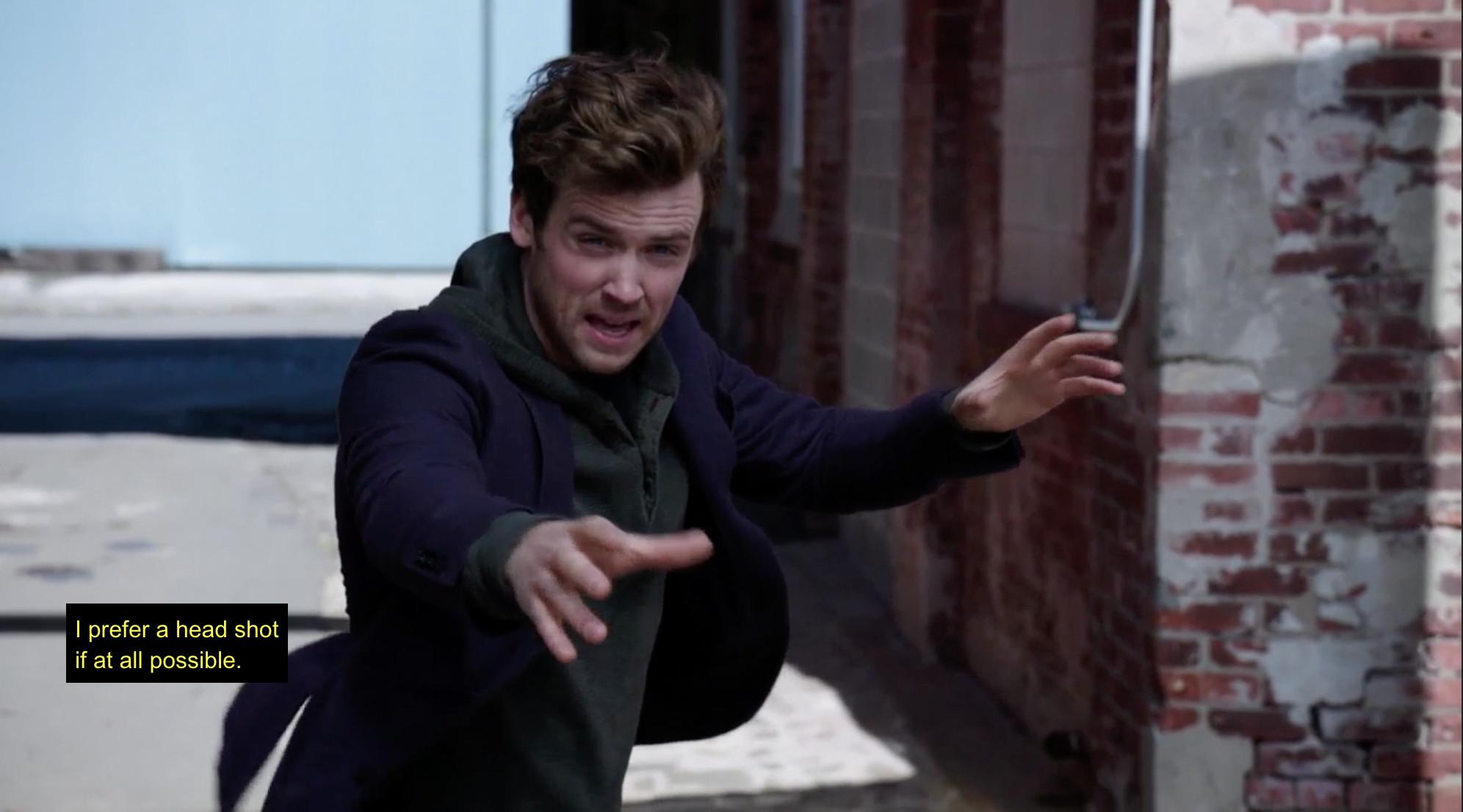 29. I’m not sure why either of them went inside the warehouse before calling for backup, but things obviously go south and Cameron ends up face to face with an armed bad guy. He humblebrags about being able to catch a bullet with his bare hands because he trained in Budapest (??).