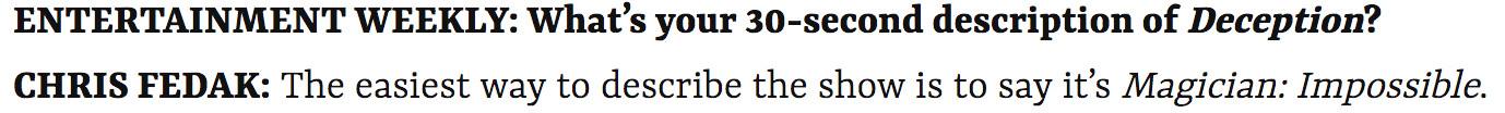2. Can we collectively refer to Deception as Magician: Impossible from this day forward? They’d have to change it eventually if we all kept tweeting, “I Love #MagicianImpossible,” right? Cool.