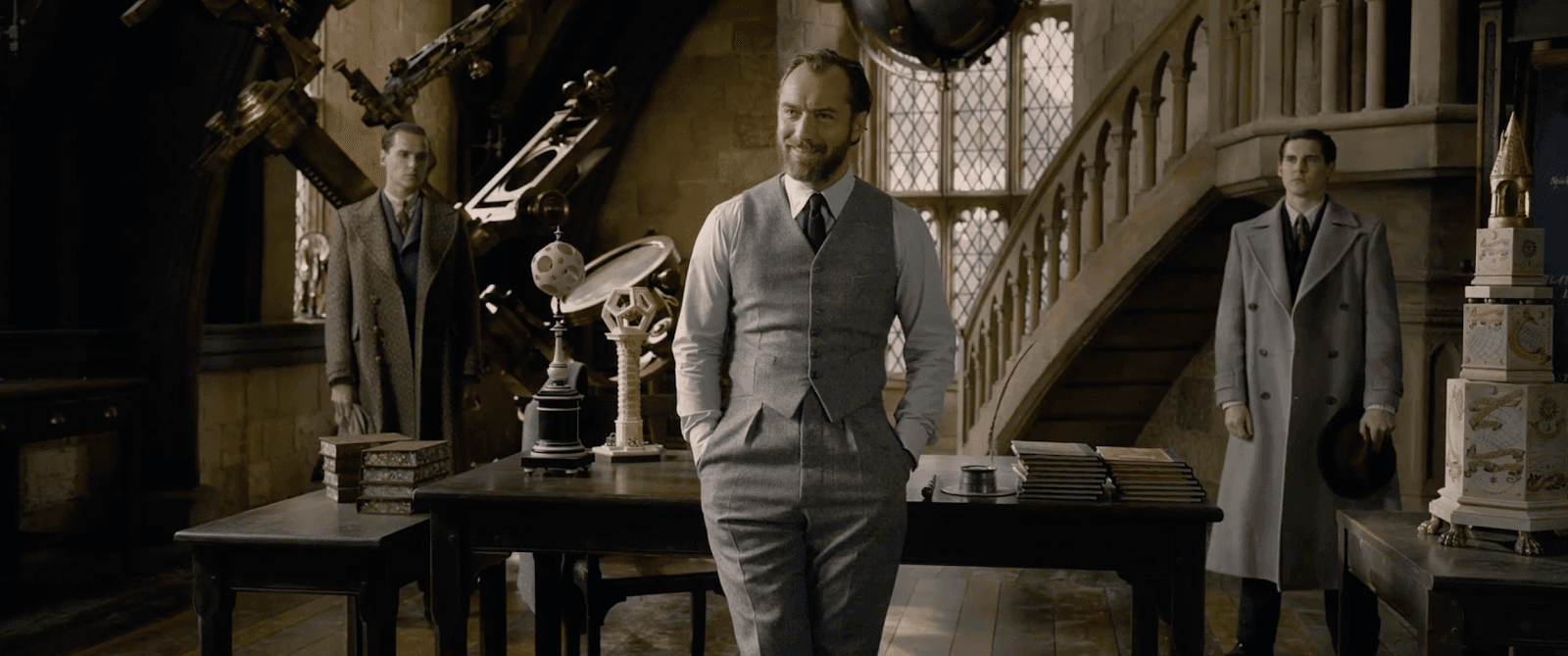 The trailer’s first shots take place at Hogwarts before Dumbledore’s headmaster days, back when he was a humble professor. We see him casually posted up in a room that should look familiar if you’ve seen the boggart scene from Prisoner of Azkaban.
