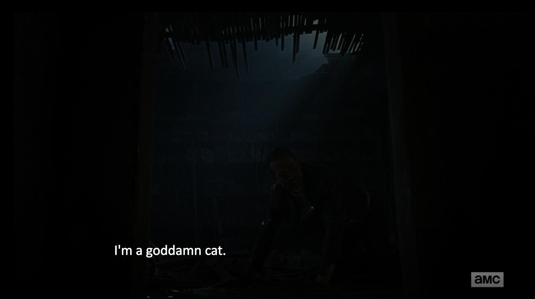 “They get to live like 75 percent kings!” Negan boasts. Not a bad deal, but why are you proposing this right now? After you fall several stories into a dark, damp basement, you don’t exactly have bargaining power.