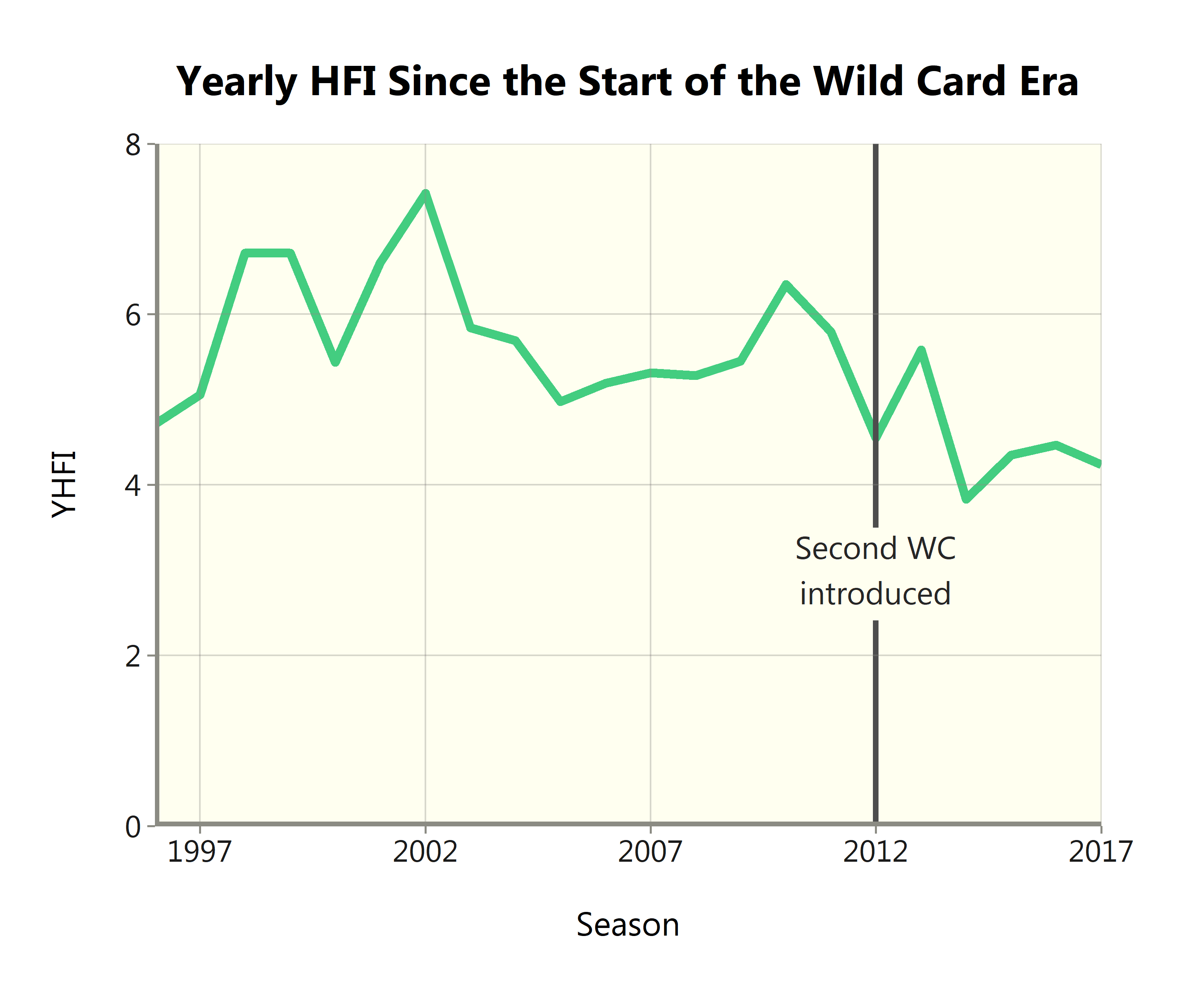 The graph below displays the yearly HFI back to 1974, save for the strike-shortened 1981, 1994, and 1995 seasons.
