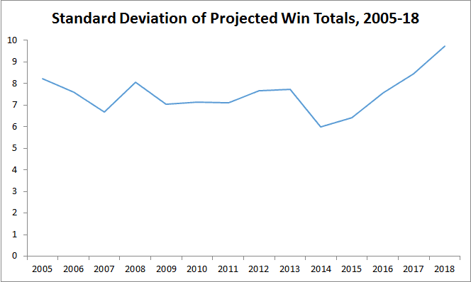 Based on that 14-year sample, the standard deviation of this year’s projected win totals—a measure of how closely individual teams’ win totals cluster around the mean—is the highest on record, besting 2017’s then-high-water mark. In other words, the league’s distribution of talent does seem less compressed than usual.