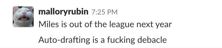 But then—through a combination of my own fatal misunderstanding of time difference, and not wanting to miss a screening of Isle of Dogs—my team was autodrafted.