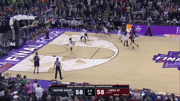 Sunday’s national championship between no. 1-seeded Notre Dame and no. 1-seeded Mississippi State ended with Notre Dame winning by 3, a result made possible by this incredible shot by Arike Ogunbowale: